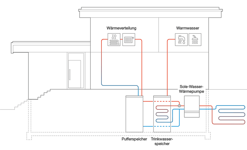 Pufferspeicher werden im Hausinnern installiert – beispielsweise im Keller oder im Technikraum. Damit möglichst wenig Wärme über die Leitungen verloren geht, sollte sich der Aufstellort des Pufferspeichers nahe der Wärmepumpe befinden. Idealerweise steht auch der Warmwasserspeicher in der Nähe (sofern Sie für Heizwasser und Trinkwasser zwei separate Tanks aufstellen).